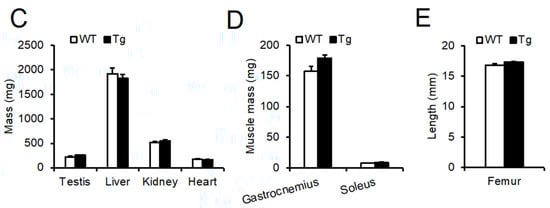 Phenotypic analysis of body mass, food intake, and peripheral tissues of the 13-line of Npgl Tg mice. (A) Weekly body mass changes (left) and body mass (right) at 26 weeks of age of WT and Npgl Tg mice. (B) Weekly food intake (left) and cumulative food intake (right) from 15 to 26 weeks of age. (C) The masses of the testis, liver, kidney, and heart. (D) The masses of the gastrocnemius and soleus muscles. (E) The length of the femur as an index of body length. Statistical analyses were performed using two-way repeated measures ANOVA followed by Bonferroni’s test (left of (A,B)) or Mann–Whitney U test (right of (A,B), and (C–E)). Each value represents the mean ± SEM (n = 5–8). Asterisks indicate statistically significant differences (* p < 0.05). Npgl, neurosecretory protein GL; WT, wild-type; Tg, transgenic.