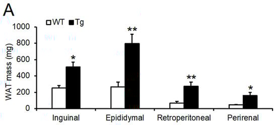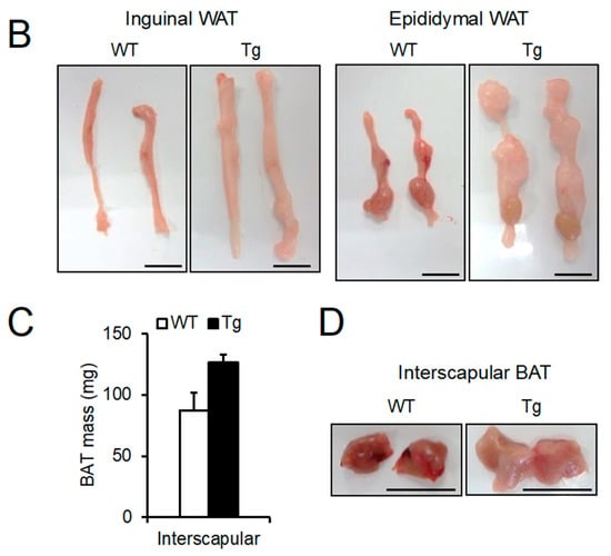 The masses of the testis, liver, kidney, and heart did not change (Figure 2C). The masses of the gastrocnemius and soleus muscles were also unaffected (Figure 2D). In addition, the femur length, an index of body length, did not change (Figure 2E). While there were no remarkable changes in the masses of internal organs, muscles, and the length of the femur, the masses of inguinal WAT, epididymal WAT, retroperitoneal WAT, and perirenal WAT were drastically increased in Npgl Tg mice (Figure 3A,B). The mass of interscapular BAT in Npgl Tg mice was not different from that in WT mice, but the BAT of Npgl Tg mice showed whitening (Figure 3C,D). Npgl Tg mice in the 17-line, in which the Npgl mRNA expression level was lower than that in the 13-line, also showed increases in the masses of WATs and BAT, similar to that in the 13-line (Figure S1).