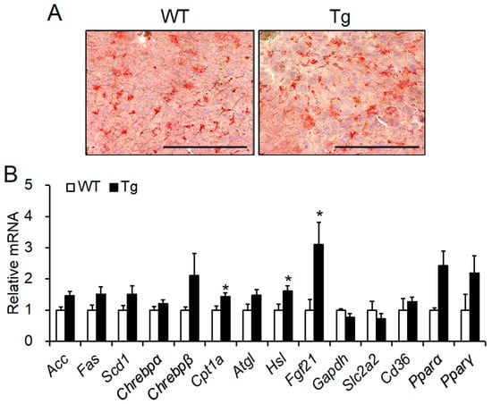 Morphological and mRNA expression analyses of the liver of Npgl Tg mice. (A) Oil red O staining of the liver sections. Red dots show lipid droplets. Scale bars = 100 μm. (B) The expression levels of mRNA for lipid metabolism-related genes in the liver. All statistical analyses were performed using Mann-Whitney U test. Each value represents the mean ± SEM (n = 5–8). Asterisks indicate statistically significant differences (* p < 0.05). Npgl, neurosecretory protein GL; WT, wild-type; Tg, transgenic.