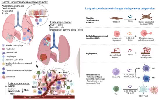 Lung microenvironment changes from physiological state to NSCLC development and progression. Normal lung microenvironment includes epithelial cells, smooth muscle cells, fibroblast, endothelial cells, and immune cells such as dendritic cells, neutrophils, T cells, and alveolar macrophages. The latter contribute to maintain immunological homeostasis, but they can also promote inflammation, and thus, development of premalignant lung lesions and carcinogenesis. During NSCLC development, the tumor microenvironment (TME) changes, thus contributing to inflammation angiogenesis, immune modulation, and therefore promoting NSCLC progression, metastasis, and prognosis. In particular, the immune TME, through specific reprogramming and modulation of T cells, tumor-associated macrophages (TAMs) and myeloid cell populations exert crucial tumor-promoting or tumor-suppressing activities. The switch from tumor immune surveillance to cancer immune escape is characterized by the recruitment of regulatory T-cells (Tregs) and upregulation of MDSCs. In addition, TAMs (M1 and M2 polarized cells), and neutrophils play a key role in the mechanisms of immune escape. In particular, they contribute to create a proinflammatory TME that strongly affects the immune response efficiency. Abbreviations: MDSCs—myeloid-derived suppressor cells; IL—Interleukin; VEGF—vascular endothelial growth factor; PD-L—programmed death-ligand; TGF—tumor growth factor; CSF—colony-stimulating factor; M-CSF—macrophage-colony stimulating growth factor. Created with BioRender.com (https://biorender.com/, accessed on 17 May 2022).