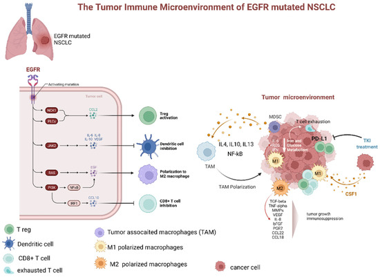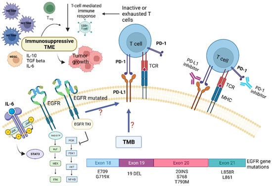 Preclinical and clinical studies have pointed out that the TME of patients with NSCLC harboring EGFR mutations displays peculiar characteristics and may modulate the antitumor immune response [6]. Several trials indicated that EGFR mutations are associated with immunosuppressive TME, lower tumor mutation burden (TMB), and increased PD-L1 expression [2,6]. TMB is defined as the total number of substitution, insertion, and deletion mutations per megabase of the coding region that encodes a tumor gene. Recent studies suggested that reduced TMB may predict a poor response to immune checkpoint inhibitors (ICIs) in patients carrying EGFR mutations [6,7]. Preclinical studies indicated that EGFR mutations lead to cancer immune escape through the PD-1/PD-L1 pathway [6]. In addition, it has been shown that EGFR mutations influence TME components, such as tumor-infiltrating lymphocytes (TILs), Tregs, MDSCs, TAMs, and immunoregulatory cytokines (Figure 2).