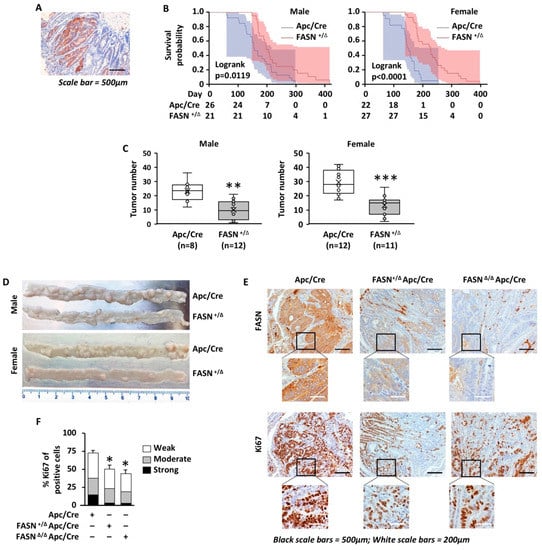 Heterozygous deletion of FASN increases mice survival and decreases the number of adenomas formed in the Apc-driven carcinogenesis mouse model. (A) Immunohistochemistry staining for FASN in intestinal tissues from Apc/Cre mice. (B) The effect of Villin-Cre-mediated heterozygous deletion of FASN in mouse intestinal tissues on mice survival. (C) The effect of Villin-Cre-mediated heterozygous deletion of FASN in mouse intestinal tissues on formation of mouse adenomas. Number of adenomas was quantified within 10 cm sections of distal intestine from Apc/Cre mice and mice with heterozygous deletion of FASN. (D) Representative images of intestinal tissues from male and female mice, Apc/Cre vs. Apc/Cre with heterozygous deletion of FASN. (E) Representative images of immunochemistry staining for FASN and Ki67 in Apc/Cre mice and Apc/Cre mice with hetero- and homozygous deletion of FASN. (F) Quantification of Ki67 staining in mouse adenomas with the different levels of FASN expression. (* p < 0.05, ** p < 0.01, *** p < 0.001).