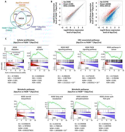 FASN promotes adenoma formation via pathways upregulation of pathways involved in cell growth and energy metabolism. (A) Venn diagram displaying the overlapping genes identified in tumors from Apc/Cre mice and Apc/Cre mice with heterozygous and homozygous expression of FASN. (B) Scatter plots showing the numbers of differentially expressed genes in Apc/Cre mice and Apc/Cre mice with heterozygous and homozygous expression of FASN. Significantly changed DEGs are indicated in colors. Red and blue dots are up- and downregulated genes, respectively. The detailed lists of differentially expressed genes are provided in Table S2A. (C) Representative gene set enrichment analysis plots generated from RNA-Seq expression data of Apc/Cre and FASN knockout mice. The bar codes indicate the location of the members of the gene set in the ranked list of all genes. ES, enrichment score; NES, normalized enrichment score; NOM, nominal p-value; FDR, false discovery rate adjusted p-value.