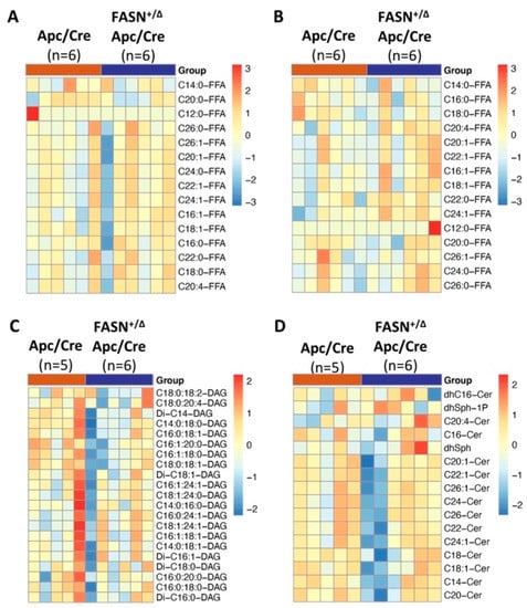 The effect of heterozygous deletion of FASN on lipid composition. Heat maps showing the composition of free fatty acids in (A) adenoma tissues and (B) plasma, and the composition of (C) diglycerides and (D) sphingolipids in mouse adenomas from Apc/Cre and FASN+/∆ Apc/Cre mice.