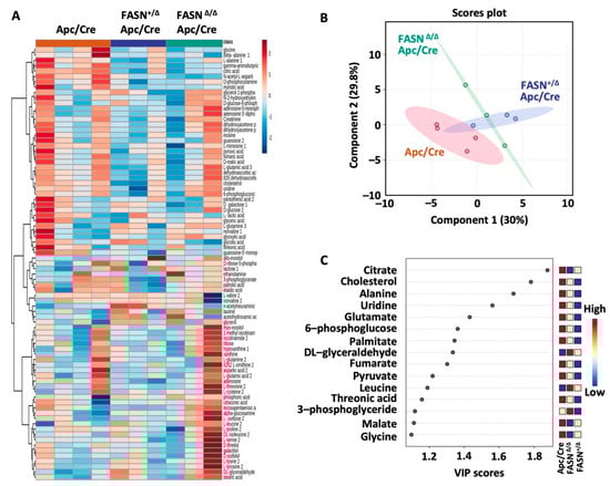Downregulation of FASN is associated with alteration in multiple metabolic intermediates in mouse adenomas. (A) Heat map demonstrating the levels of metabolites (log normalization) identified in adenoma tissues from Apc/Cre (n = 4) and Apc/Cre mice with hetero-(n = 3) and homozygous (n = 3) deletion of FASN. (B) Partial least-squares discriminant analysis (PLS-DA) on metabolic data from Apc/Cre, FASN+/∆ Apc/Cre, and FASN ∆/∆ Apc/Cre mice. (C) Variable importance in projection (VIP) values from PLS-DA. The VIP score of a metabolite is calculated as a weighted sum of the squared correlations between the PLS-DA components and the original variable (FASN expression). The x-axis indicates the VIP scores corresponding to each metabolite on the y-axis.