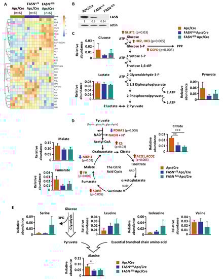 FASN knockdown alters the levels of metabolites and metabolic enzymes involved in glycolysis, TCA cycle, and amino acid metabolism. (A) Heat map demonstrating expression of metabolic enzymes as determined by Reverse Phase Protein Array (RPPA) analysis. (B) The level of FASN expression by western blot of mouse adenomas used for RPPA analysis. (C) FASN-mediated changes in metabolites and metabolizing enzymes within glycolysis. (D) FASN-mediated changes in metabolites and metabolizing enzymes within the TCA cycle. (E) Hetero- and homozygous knockdown of FASN alters the levels of branched-chain amino acids and decreases synthesis of alanine. (* p < 0.05, ** p < 0.01, *** p < 0.001).