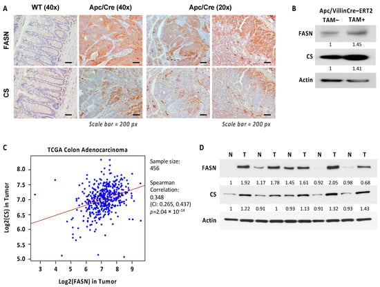 Expression of FASN correlates with expression of CS in CRC. (A) Expression of FASN and CS in intestinal tissues of wild type (WT) C57BL/6J mice and in intestinal tissues and adenomas in Apc/Cre mice. (B) Heterozygous deletion of Apc gene using tamoxifen (TAM) inducible Villin-Cre recombinase leads to upregulation of FASN and CS in mouse intestinal tissues. Tamoxifen was injected for 5 days, and intestinal tissues were collected on day 10 after the last injection. (C) Correlations between FASN and CS were determined based on RNA-Seq data of CRC patient tumor tissues (n = 456) from The Cancer Genome Atlas. (D) Expression of FASN and CS in human normal colon mucosa and matched tumor tissues. N-normal mucosa, T-primary tumor.