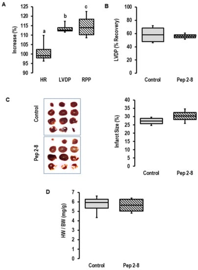 Effect of PCSK9 inhibition on post-ischemic recovery. (A) Effect of Pep2-8 (10 µM, striated bars) on heart rate (HR), left ventricular developed pressure (LVDP) and rate pressure product (RPP) in the pre-ischemic period (n = 4 each; a; p = 0.738 vs. pre-treatment; b; p = 0.002 vs. pre-treatment; c; p = 0.018 vs. pre-treatment; Student’s t-test for paired samples). (B) Effect of Pep2-8 on left ventricular developed pressure (LVDP) after 120 min of reperfusion, expressed as % of pre-ischemic values; p = 0.728 vs. control; Student’s t-test for unpaired samples. (C) Effect of Pep2-8 on infarct size (left original registration, right quantification (p = 0.215 vs. control; Student’s t-test for unpaired samples). (D) Effect of Pep2-8 on heart weight to body weight ratio (p = 0.923 vs. control; Student’s t-test for unpaired samples). Data are full ranges (whiskers) with median and 25 and 75% quartiles (boxes).