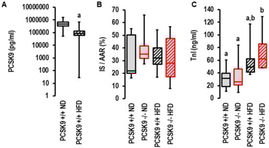 Effect of PCSK9 genetic deletion and high-fat diet on serum PCSK9 levels and infarct sizes in vivo. (A) Effect of high-fat diet (HFD, n = 30) on serum PCSK9 levels compared to normal diet (ND, n = 8); a; p = 0.003; Student’s t-test for unpaired samples. Non different groups are indicated by identical letters (a,b). (B) Inarct sizes (IS) normalized to area of risk (AAR) analyzed using 1-Way ANOVA (p = 0.949) and 2-Way ANOVA (p = 0.951 for genotype; p = 0.892 for diet; p = 0.587 for interaction; HFD: n = 10 each; ND: n = 6 each. (C) Infarct sizes measured as troponin I release in serum samples analyzed using 1-Way ANOVA (p = 0.022) and 2-Way ANOVA with p = 0.330 for genotype, p = 0.003 for diet, and p = 0.646 for interaction; ND: n = 8 (wild-type) and n = 9 (knockout); HFD: n = 6 (wild type) and n = 5 (knockout). Data are full ranges (whiskers) with median and 25 and 75% quartiles (boxes).