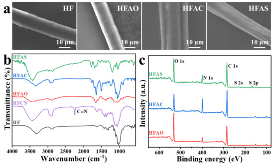 The SEM images of HFs, HFAO, HFAC, and HFAS in Figure 2a show that all the HF-based materials remained fibrous in structure. The sample of HFs showed the smoothest surface among all the samples. Some etches on the surfaces of HFAS and HFAC could be observed after further modification. Fortunately, the backbones of HFAO, HFAC, and HFAS were not damaged by the several steps of chemical modification. The Fourier transform infrared (FTIR) spectroscopy and X-ray photoelectron spectroscopy (XPS) spectra of the HF-based adsorbents are listed in Figure 2c,d. Compared with the spectra of the HFs, the stretching vibration of C≡N on HFCN showed at 2251 cm−1, indicating the successful modification by acrylonitrile [43]. The peak of C≡N groups disappeared in the spectra of HFAO, HFAC, and HFAS after amidoximation (Figure 2c). The new peaks at 1772 cm−1 (HFAC) and 1787 cm−1 (HFAS) were due to C=N-O groups, indicating the successful introduction of HDI onto the hemp fibers. From the spectra of HFAS, the peak at 1202 cm−1 suggested the modification of SO3− groups [44]. All the HF-based adsorbents were further analyzed by XPS tests to determine the surface chemical bonding status (Figure 2d). The higher N element content of HFAC and HFAS compared with HFAO revealed by XPS spectra indicated that HDI and DMEA were successfully modified onto HFAC and HFAS. Furthermore, the XPS survey scan spectra of HFAS proved the existence of S 2p (168.1 eV) and S 2s (231.1 eV), which was indicative of atoms from sulfobetaine [45,46].