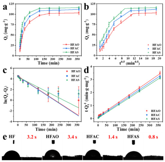 Contact time (a) and kinetics study on HFAO, HFAC, and HFAS; W-M (b), pseudo-1st-order (c), and pseudo-2nd-order (d) models linearly fitted curves at pH 8.3; water contact angle and total permeant time of HF-based adsorbents (e).