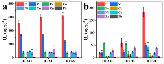 Adsorption capacity of HFAO, HFAC, and HFAS in ion competing solution (a) and seawater (b).