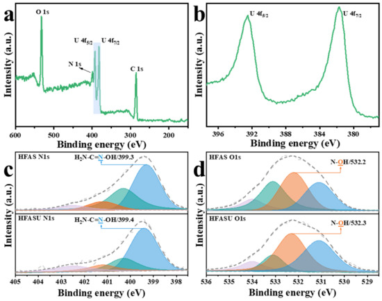 The XPS spectroscopy of HFASU (a), high-resolution spectra of U 4f (b), N 1s (c), and O 1s (d) of HFAS and HFASU.
