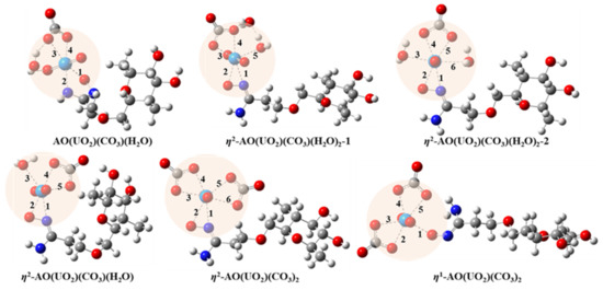 DFT calculation was employed to understand the contribution of N and O atoms from the AO group in depth. The resulting six structures showed lower binding energy (Eads) than UO2(CO3)34− (−31.8 eV), as shown in Figure 6 and Table S6, indicating greater stability than UO2(CO3)34− and the trend of coordination between the adsorption sites and U(VI) ions [53,54]. AO(UO2)(CO3)(H2O) exhibited the lowest Eads (−38.8 eV) among the six structures, and it chelated with the U(VI) ion by the N atom from the amino group and the O atom from the oxime part in the AO group. Other structures coordinated U(VI) ions only with the oxime parts. η2-AO(UO2)(CO3)(H2O)2-1, η2-AO(UO2)(CO3)(H2O)2-2, η2-AO(UO2)(CO3)(H2O), and η2-AO(UO2)(CO3)2 replaced two CO32− from UO2(CO3)34− to coordinate U(VI) ions, and water molecules from the aqueous solution stabilized the coordination structures by direct participation or hydrogen bonds. In the structure of η1-AO(UO2)(CO3)2, only one O atom from the oxime part bound with a U(VI) ion. The higher Eads of η2-AO(UO2)(CO3)2 and η1-AO(UO2)(CO3)2 with respect to the other structures may be because two CO32− in the coordination structure occupied the equatorial ring of the U(VI) ion and did not leave much space for the AO group. In addition, the AO group on cellulose may have led to steric hindrance in the structures. Thus, both the XPS analysis and DFT calculation results proved that the AO groups on HFAS were the main U(VI) adsorption groups. In this case, the high affinity of HFAS for U(VI) was due to the introduction of the SB-type zwitterionic group containing soft sides, which improved the hydrophilicity of the material but locally expelled the water molecules surrounding the AO group, which, in turn, reduced the competition between water molecules and the U(VI) ions and increased the opportunity of contact between the H2N-C=N-OH groups and U(VI) ions.