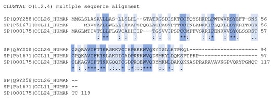 - Kitaura, M.; Suzuki, N.; Imai, T.; Takagi, S.; Suzuki, R.; Nakajima, T.; Hirai, K.; Nomiyama, H.; Yoshie, O. Molecular cloning of a novel human CC chemokine (Eotaxin-3) that is a functional ligand of CC chemokine receptor 3. J. Biol. Chem. 1999, 274, 27975–27980. [Google Scholar] [CrossRef]