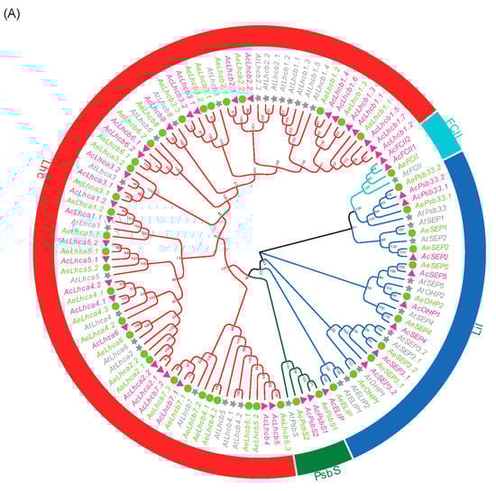 - Zhao, Y.; Kong, H.; Guo, Y.; Zou, Z. Light-harvesting chlorophyll a/b-binding protein-coding genes in jatropha and the comparison with castor, cassava and arabidopsis. Peer J. 2020, 8, e8465. [Google Scholar] [CrossRef]