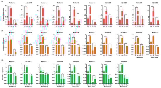 2.5. RT-qPCR Validation of Kiwifruit LHCs in Different Tissues