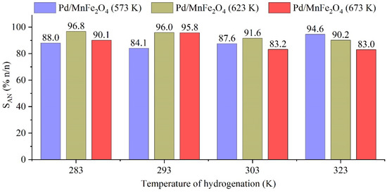 | Pd/MnFe2O4 (623 K) | 8 ± 2 | 66.0 | 15 ± 3 | 25.7 | 4 ± 1 | 4.64 | 69 | 99.9 (40 min) (323 K) | 96.7 (240 min) (283 K) | 96.8 (240 min) (283 K) |
