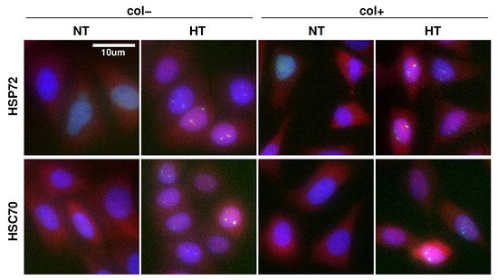 Immunofluorescence staining of HSPs and HSF1. HeLa-HSF1:eGFP cells exposed to normothermia (NT) at 37 °C or hyperthermia (HT) consisting of a one hour at 43 °C for two different culture conditions: with collagen coating (col+) or not (col−). HSP (red channel), HSF1:eGFP (green channel), Hoechst (blue channel). In HT, bright green spots localized in the nucleus correspond to HSF1 foci.
