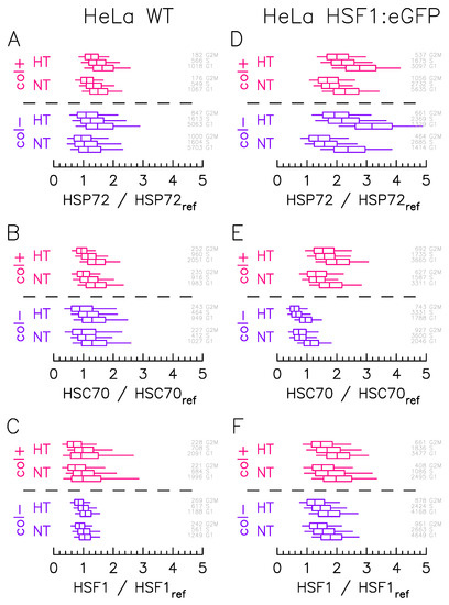 We first precisely quantify the protein expression variability from immunofluorescence experiments (Figure 1). The quantification study is carried out on samples exposed to NormoThermia (NT) at 37 °C or HyperThermia (HT) consisting of a one hour at 43 °C. Two different culture conditions are performed: presence of ECM made of collagen coating (col+) or not (col−). The quantification procedure concerns, in addition to the transcription factor HSF1, the two main molecular chaperones of the HSP70 family: HSP72 (HSPA1A), a stress inducible chaperone and HSC70 (HSPA8), a constitutively expressed one (Figure 1) [12]. In order to normalized each fluorescence measurement to a reference value, we use here the median expression in culture condition of Hela WT cells. The protein expression variability displays log-normal distributions that are here represented by box and whisker plots, the number of counting cells being in gray at the right (Figure 2). Interestingly, the expression variability can additionally be segmented according to the cell cycle phases (S, G1 and G2+M) via Hoechst labeling in immunofluorescence protocol. Cell cycle phases have indeed also been proposed as source a major of protein expression variability. If the HF1:eGFP insertion eases activation follow-up in living cells through time lapse microscopy, it also induces a genetic modification potential extra-source of expression variability. So, we quantified the distributions in the genetically modified HeLa cell line (Figure 2D–F), but also in the wild type one (Figure 2A–C).