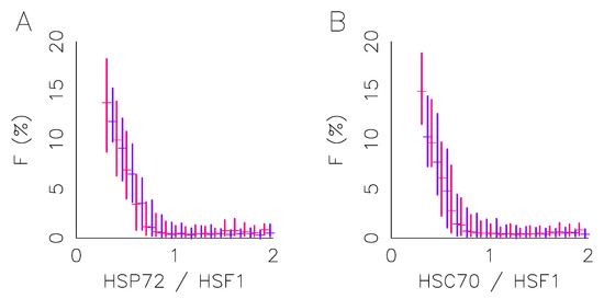 However, we checked here that the response activation function is unaffected by the presence or absence of the ECM (Figure 3). The fraction of HSF1 fluorescence within foci (F) is quantified in each cell on immunofluorescence images obtained with the HeLa-HSF1:eGFP cell line after one hour of exposure at 43 °C (see Figure 1 for an example of foci upon stress). Therefore, we may correlate, for each cell, the F measurements, with the expression level of the transcription factor HSF1, and the expression level of the molecular chaperone. It has been previously shown how F depends on the expression ratio. We thus segment the data according to the value of the expression ratio and calculate quartiles of the F distribution in each ratio class in order to represent the whole data set in a concise way. Regardless of the molecular chaperone considered, the activation function appears to be identical in both culture conditions. The vertical lines in Figure 3 represent the interquartile range, in red for the culture on collagen and in blue without, the median value is also indicated. Note that only classes with more than 30 cells are shown.