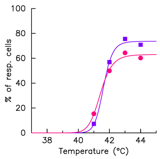 Fraction of responding cells. The HSF1:eGFP fluorescence and fraction of HSF1:eGFP fluorescence in nSBs (F) are monitored over time in a single cell upon a 41–44 °C heat stress, time zero coincides with the stress onset. The fraction of cells having detectable fluorescence foci during the hyperthermia phase (dots) are displayed as function of the exposure temperature in col+ (red) and in col− (blue) conditions. The solid lines, which correspond to the result of the adjustment by a Hill function, serve only as eye guidance.