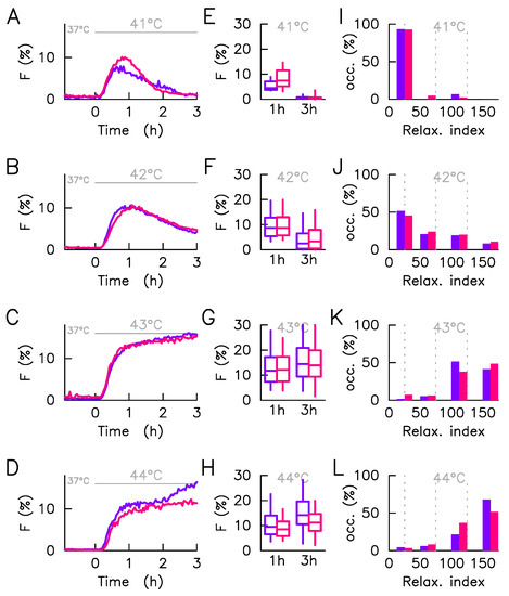 Cell-to-cell variability of responding cells in heat shock response. The HSF1:eGFP fluorescence and fraction of HSF1:eGFP fluorescence in nSBs (F) are monitored over time in a single cell upon a 41–44 °C heat stress, time zero coincides with the stress onset. Each line of the plot corresponds to a given stress condition. In all panels, measurements obtained with cells adhered to non-coated are displayed in red whereas those obtained with cells adhered to collagen-coated are displayed in blue. The statistical analysis is here restricted to responding cells. (A–D)—Average foci intensity over time, the average is computed on responding cells only. (E–H)—Distribution of foci intensity in responding cells displayed at two time points (1 h and 3 h post HS) by box-and-whisker plot ( whiskers represent 9th percentile and the 91st percentile). (I–L)—Histogram of the relaxation index, four bins are used: , , , and . The relaxation index is defined as the ratio of the foci intensity measured in a given cell at three hours after the stress onset to the one measured one hour after the stress onset.
