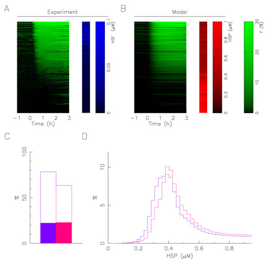 For the parametric estimation of the HSP concentration in each cell, the total HSF1:eGFP fluorescence of each cell is used to determine the parameter . For this, a proportionality relation is assumed between the fluorescence of HSF1:eGFP and the concentration of HSF1 in each cell, the conversion factor is obtained by making the average value of the fluorescence intensity cohere to the reference value of the model established in [9] and reported in the Table 1. This fluorescence renormalization procedure is also used for the representation in Figure 6A. The value of the initial concentration of HSP, , is then freely variable. The duration of the stress being much shorter than the characteristic time of evolution of HSP, we have chosen for simplicity to vary the initial concentration rather than the value of the model parameters. This facilitates the direct comparison with the biochemical measurements presented in Figure 3.