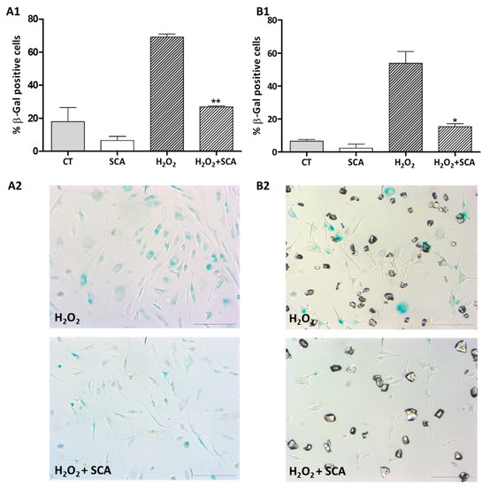 Determination of senescence, β-galactosidase staining. (A1,B1) Percentage of β-galactosidase-positive cells at different conditions (H2O2 vs. H2O2 + SCA® ** p < 0.005, * p < 0.05; H2O2 vs. C * p < 0.05). (A2,B2) Representative images of β-galactosidase blue staining. A column corresponds to fibroblasts, and B column corresponds to B16-F10 cells. (C: Control Cells; SCA®: control cells treated with SCA®, H2O2: Aged control cells, H2O2 + SCA®: aged cells treated with SCA®). Scale bars: 200 μm.