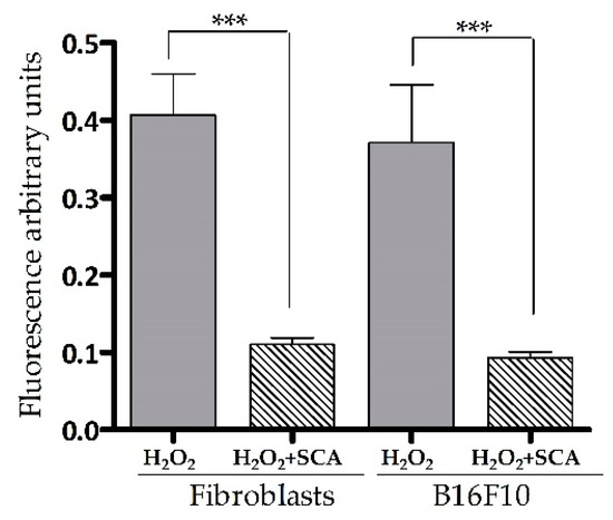Intracellular ROS levels were determined by fluorescent 2′,7′-dichlorofluorescin diacetate (DCFH-DA) ROS-sensitive probe accumulation across the same conditions as indicated above. As expected, an increase in DCFH-DA fluorescence (equivalent to ROS accumulation) was observed in cells exposed to H2O2. On the contrary, cells treated with SCA® experienced a significant decrease in DCFH-DA fluorescence compared with cells not treated with SCA (by 72.5% and 72.6%, *** p < 0.0001, in fibroblasts and B16-F10 cells, respectively (Figure 2)).