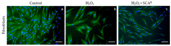 SCA® treatment reversed morphological changes associated with senescence. Representative tubulin cytoskeleton images of control fibroblasts (a), fibroblasts treated with H2O2 (b), and fibroblasts treated with H2O2 + SCA (c). Representative inverted fluorescence microscopy images immunostained with anti-a-tubulin antibody appear in green, while nuclei that were stained with Hoechst probe appear in blue. Scale bars: 200 μm.