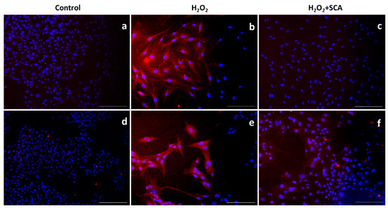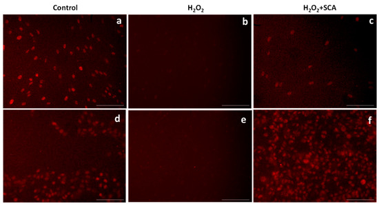 Treatment with SCA® markedly induced SIRT1 expression in senescent cells. Representative fluorescence microscopy images after SIRT1 (red) immunostaining. Cells treated with H2O2 (b,e) showed decreased expression of SIRT1. Fibroblasts (a–c) and B16-F10 cells (d–f) were exposed to H2O2 and treated with SCA® (c,f). Scale bars: 200 μm.