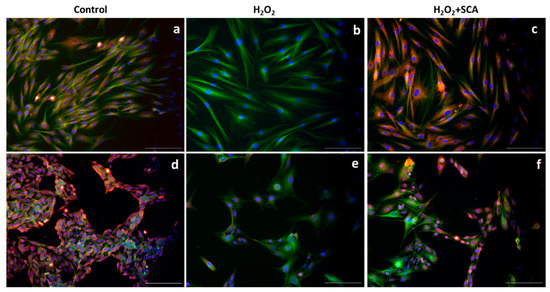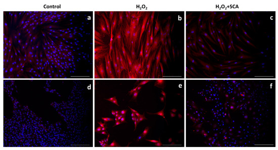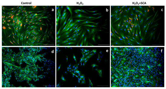 Treatment with SCA® significantly promoted SIRT6 expression in senescent cells. Representative fluorescence microscopy images after SIRT6 (red) immunostaining. Green color shows cytoskeleton staining with anti-a-tubulin, and nuclei were stained blue with Hoechst probe. Fibroblasts (a–c) and B16-F10 cells (d–f) exposed to H2O2 (b,e) and H2O2-exposed cells and treated with SCA® (c,f). Scale bars: 200 μm.