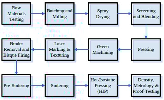 One example of a manufacturing process flow diagram for the production of biomedical Si3N4 intervertebral spinal spacers. The image is printed with permission from ref. [31].
