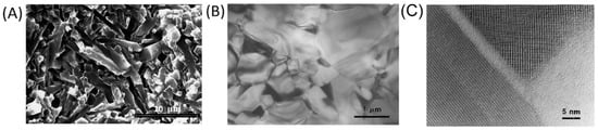 Rare-earth oxide additives have also been added to Si3N4 to obtain specific microstructures and improve mechanical properties [57]. For instance, Liu et al. [30] prepared in-situ reinforced Si3N4 via gas pressure sintering with La2O3, Y2O3, and SrO additives. Two crystalline rare-earth apatite phases, Y5Si3O12N and La5Si3O12N, were detected at grain boundaries with a thickness of approximately 1.7 nm. Amorphous phases also appeared at the two-grain boundaries, with thicknesses ranging from 0.7 to 3.0 nm due to incomplete recrystallization. This was found to be beneficial for superior high-temperature strength. In this sintering system, a complete transformation from -Si3N4 to -Si3N4 was successfully achieved, and the average grain diameter was circa 0.8 µm, with an aspect ratio greater than 4. Moreover, as shown in Figure 2A, there was an interlocking microstructure that was resistant to crack propagation. Under compressive loads, the acicular grains interlock and can inhibit grain-boundary sliding, thus improving creep resistance. In addition, the elongated grains can contribute to the stress rupture performance via the bridging of microcracks.