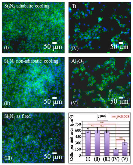 Surface functionalization is one of the most effective techniques to improve material properties for specific applications. In particular, chemical surface modifications have a strong influence on cellular response and protein adsorption [83]. To some extent, progenitor cells can sense the intrinsic characteristics of the surface and receive signals released from the biomaterials. Usually there are electrically charged ionic sites and quantum dots distributed on the surface of bioceramics, which can influence cell metabolism or prompt protein folding on their surface. Specifically, for Si3N4, surface phases and off-stoichiometry can be effective factors in cell/surface interaction processes. The surface chemistry of Si3N4 can be influenced by different pressurized heat-treatments and by sintering additives. Yttrium oxide (Y2O3) is the most popular commercial additive, and there are also crystalline phases formed from the gain-boundary by products in Si3N4, such as N-apatite (Y10(SiO4)6N2), M-melilite (Y2Si3N4O3), N-YAM (Y4Si2O7N2), and N-wollastonite (YSiO2N) [29,84]. Pezzotti et al. [29] examined the interaction between various chemically modulated Si3N4 surfaces and murine mesenchymal progenitor cells (Figure 4 and Figure 5). It was found in their study that thermal-treatment coupled with adiabatic cooling could lead to partial coverage with N-apatite (Y10(SiO4)6N2), while non-adiabatic cooling resulted in full coverage by mostly yttrium silicate (−Y2Si2O7). These surface phases were found to induce the differentiation of murine mesenchymal progenitor cells into osteoblasts. Although the N-apatite coverage was limited, the final amount of bone formation was comparable to full coverage by mainly Y-disilicate phase. As-fired samples before a N2-annealing cycle were also prepared in this study. They compared the N-apatite phase Si3N4 samples with aluminum oxide and a titanium alloy. A quantification method to monitor KUSA-A1 mouse osteoblast cell proliferation was used to calculate the number of cells per unit. The results showed that the three Si3N4 groups had similar cell numbers but four-fold and two-fold higher than those of the titanium alloy and aluminum oxide. However, the Gla-/Glu-osteocalcin and growth factor (IGF-1) results indicated that the two groups with modified surface stoichiometries had higher cell differentiation and apatite growth. This same research group also examined the reciprocity between Si3N4 and living cells as a consequence of the off-stoichiometric chemical nature of its surface at the nanometer scale to see how Si3N4 affected cellular signal transduction functions and differentiation mechanisms (Figure 6) [15]. The study identified that some peculiar chemical agents (i.e., NH4+, H4SiO4, and Si-QDs) residing on the surface of Si3N4 ceramics affected the metabolic activity of living SaOS-2 cells.