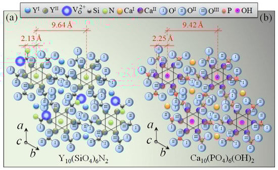The (0001) view of the hexagonal apatite structures of N-(a) and Ca-(b) apatites. The image is reprinted with the permission from ref. [29]. Copyright 2017 Elsevier Publishing Group.