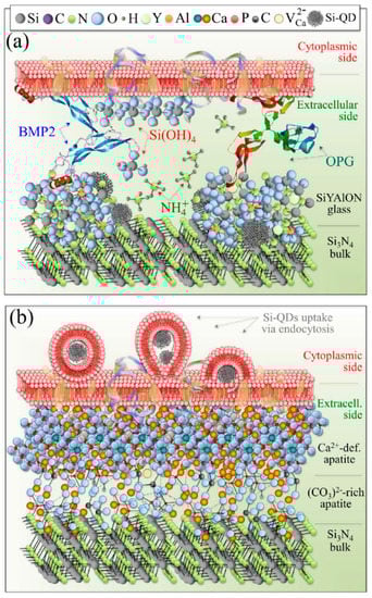 Schematic illustrations of the hypothesized metabolic activity of SaOS-2 cells on the surface of N2-annealed Si3N4: (a) the early-stage interaction with elementary molecules emitted from the Si3N4 surface and release of OPG and BMP2; and (b) the deposition of carbonate apatite and hydroxyapatite layers with concurrent endocytosis of Si-QDs. The image is reprinted from ref. [15].