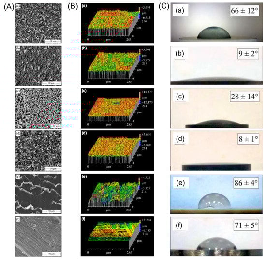 (A) SEM photographs; (B) white light interferometer oblique topographical plots; and (C) water droplet wetting angle photographs and measurements of (a) Af-Si3N4, (b) N2-Si3N4, (c) Gl-Si3N4, (d) Ox-Si3N4, (e) PEEK, and (f) Ti6Al4V. This image is adapted with permission from ref. [103]. Copyright 2017 Willey publishing group.