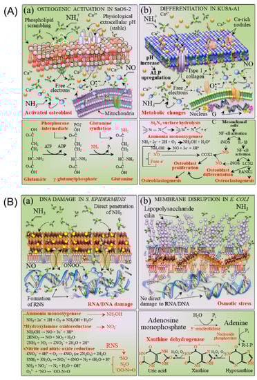 (A) Schematic diagrams of (a) SaOS-2 and (b) KUSA-A1 cell lines interacting with a Si3N4-activated aqueous environment. At the bottom of the respective draft, the cascade of the main chemical reactions involved with the substrate interaction is shown, which leads to glutamine synthetase and osteoblastogenesis in the (a,b) cases, respectively. In (a), the scrambled plasma membrane phospholipids PS, PC, and PE are drawn in red, brown, and beige colors, respectively, while the mitochondrial membrane is depicted in a uniform violet color. In (b), the nucleus membrane is represented by the green color. (B) Schematic diagrams of (a) S. epidermidis and (b) E. coli bacterial strains interacting with a Si3N4-activated aqueous environment. At the bottom of the respective draft, the cascade of the main chemical reactions involved with the substrate interaction is shown, which leads to direct RNA/DNA damage upon direct penetration of ammonia and membrane disruption by osmotic stress in the (a,b) cases, respectively. The lower panels to the drafts in (a,b) show the main chemical reaction, leading to RNS formation at the S. epidermidis/substrate biomolecular interface and the main path of metabolic stress detected in E. coli on the Si3N4 substrate, respectively. This image is reprinted with permission from ref [114]. Copyright 2019 ACS publishing group.