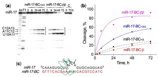 - Patutina, O.A.; Bazhenov, M.A.; Miroshnichenko, S.K.; Mironova, N.L.; Pyshnyi, D.V.; Vlassov, V.V.; Zenkova, M.A. Peptide-Oligonucleotide Conjugates Exhibiting Pyrimidine-X Cleavage Specificity Efficiently Silence MiRNA Target Acting Synergistically with RNase H. Sci. Rep. 2018, 8, 14990. [Google Scholar] [CrossRef] [PubMed] [Green Version]