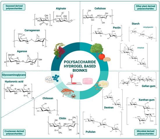 Most relevant polysaccharides from different sources used as raw materials for the fabrication of hydrogel-based bioinks for 3D bioprinting applications. Image created with BioRender.com.