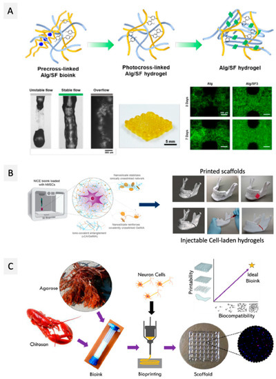 Schematic representations of some approaches used for the manufacturing of bioinks from seaweed derived polysaccharides. (A) Alginate/SFMA bioinks pre-crosslinked with CaCO3 and then photocrosslinked to produce stable printed constructs with high cell viability (Reproduced with permission from [66]. Copyright American Chemical Society, 2021); (B) NICE bioinks composed by carrageenan, nSi, and GelMA to produce printed mandibular models (Reproduced with permission from [74]. Copyright American Chemical Society, 2020); and (C) bioinks combining agarose and NOOC with high printability and cell viability (Reproduced with permission from [79]. Copyright Elsevier, 2021).