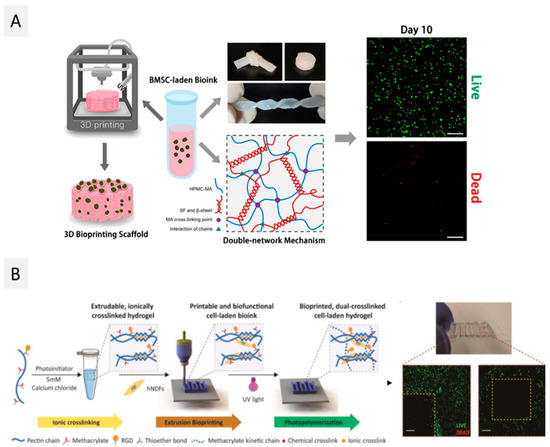 Cellulose, the major component of plant cell walls, is the most abundant polysaccharide on Earth and consists of β-D-glucopyranose units linked by β-(1,4) glycosidic bonds [121,122], with a variable degree of polymerization (10,000 for native cellulose, 15,000 for cotton plant-fiber cellulose, and after extraction for other plant fibers the range is about 800–10,000, depending on the applied treatment). The high density of free hydroxyl groups contributes to the abundant intra- and intermolecular hydrogen bonds within and between individual chains, promoting their association into cellulose fibers. These cellulose fibers consist of highly ordered (crystalline) and disordered (amorphous) motifs arranged in an alternating fashion. Cellulose fibers are essentially used to produce paper or textiles and, more recently, in the composite industry [123]. However, this strong network of hydrogen bonds is also responsible for the insolubility of cellulose in most common solvents [122]. To overcome this issue, chemical modification of cellulose permits the production of cellulose derivatives with a plethora of properties and applications [124,125]. Carboxymethyl cellulose (CMC), methyl cellulose, ethyl cellulose, hydroxyethyl cellulose, hydroxypropyl methyl cellulose, and mixed ethers such as hydroxyethylmethylcellulose, obtained by reaction of cellulose fibers with alkyl halides in alkaline medium, are some examples of commercially available cellulose derivatives. These cellulose derivatives can be obtained with different degrees of substitution (DS) and, therefore, with a panoply of properties. The use of cellulose derivatives for the development of bioinks has been recently reviewed [126,127], and it is mainly focused on the exploitation of CMC. However, other cellulose derivatives, such as methyl cellulose [101], hydroxyethylcellulose [112], and hydroxypropyl methyl cellulose [113,114], are also starting to be studied in this context. For instance, Ni et al. [114] mixed silk fibroin with hydroxypropyl methyl cellulose, that was previously methacrylated, in different proportions (3:1, 2:2 and 1:3) to bioprint, through extrusion, bone marrow-derived mesenchymal stromal cells (BMSC)-laden double network hydrogels for cartilage tissue repair, as seen in Figure 3A. Regardless of the proportions used, the mechanical properties of the double network hydrogels were improved when compared to the hydrogels contain only silk fibroin or methacrylated hydroxypropyl methyl cellulose. Nonetheless, increasing the silk fibroin (proportion 3:1) resulted in higher mechanical strength, with compressive stress at 50% strain above 100 kPa. The proliferation of BMSCs was addressed using the WST-1 assay, and it was shown that cells proliferated slowly between day 1 and day 7 (0.29 and 0.40, respectively) and then started to proliferate quickly at day 10 (0.86). The LIVE/DEAD assay revealed that the dead cells were up to 46% due to the shear stress imposed on the cells and the UV irradiation at day 1, and decreased to 3% at day 10, which indicates that the formulated hydrogel offers an excellent microenvironment for BMSCs to grow and proliferate.