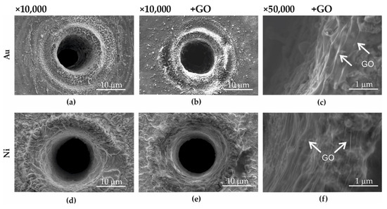 Studies made by means of a scanning electron microscope (SEM) showed that the deposition of graphene oxide on the surface of the microsieves Au + GO (Figure 1b,c) and Ni + GO (Figure 1e,f) resulted in a GO layer that was located over the entire surface of the sieve. The edges of the graphene sheets overlapped to form a relatively even layer, not only on the flat surface between the holes but also on the top of the microholes and on the inside of the microholes (Figure 1c,f). In addition, it was also observed that the graphene oxide layer reduced the development (roughness) of the surface.