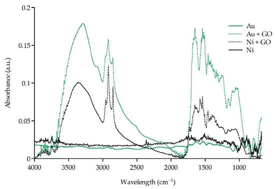 The FTIR spectra of the Au, Au + GO, Ni, and Ni + GO surfaces.