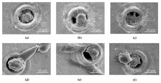 The microsieve surface analysis conducted by the scanning electron microscope revealed that the sieves made of Au and Au + GO gold foils were far more covered in cancer cells that adhered and proliferated (Figure 3a–f) than the nickel one (Figure 4a–f).