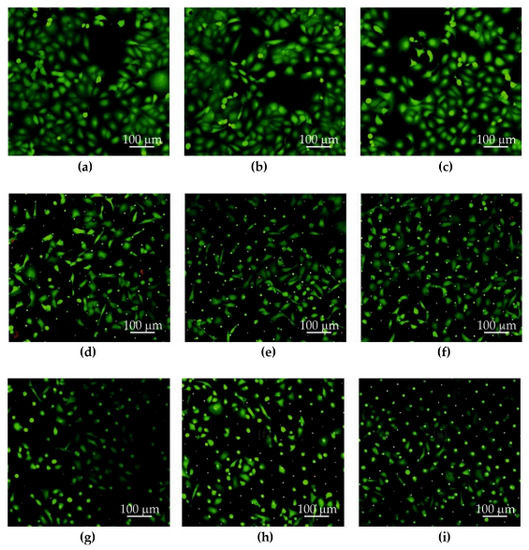 Although the studies with nickel microsieves showed a high sieving efficiency (Ni—84. 8%), during the new phase of culturing, the cells did not adhere to the surface or proliferate. Only a few nested cancer cells were seen in the microholes (Figure 7d–f). This part of the study showed that pure nickel is unsuitable for further cultivation. It was noted that the Ni + GO microsieves had an increased efficiency of cell screening (94.5%) and the cells were more numerous (Figure 7g–i). However, they were not in good condition as the cells in the control samples (Figure 7g–i). It should also be noted that these cells were not only located in the microholes, but also on the surface of the microsieve. A greater number of dead cancer cells with a damaged cell membrane (red dots) or with metabolism disorder (green patched pattern) were observed, indicating processes that could lead to their death.