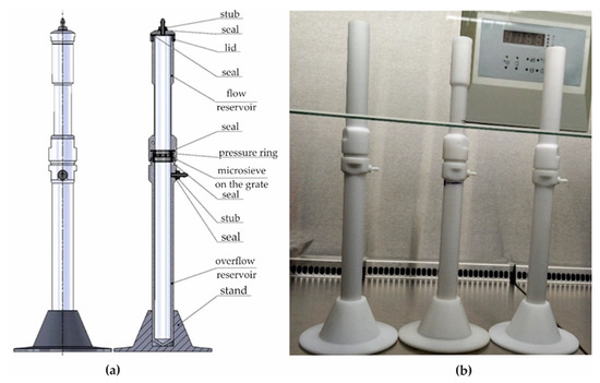 The screening column designed (Figure 8a) and constructed (Figure 8b) allows the isolation of cancer cells in the blood analysis of cancer patients during screening (Military University of Technology, Warsaw, Poland). The main components of the sieve column were a flood and overflow reservoir and a separator that included a microsieve, which was used depending on the intended test: Au, Au + GO, Ni, or Ni + GO. The microsieve was placed on the grate and pressed with a ring (Military University of Technology, Warsaw, Poland).