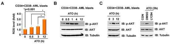 2.2. ATO-Induced ROS Activation Is Attenuated by Concomitant Activation of the p-Akt/Nrf2 Antioxidant Pathway in LSC-Enriched AML Progenitor Cells